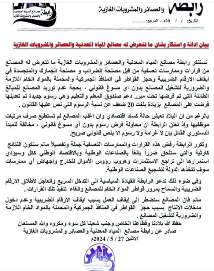 وعبرت الرابطة في بيان صدر الاثنين 27 مايو 2024، عن استنكارها للقرارات والممارسات التعسفية التي تتخذها مصلحة الضرائب ومصلحة الجمارك التابعتين لسلطة مليشيا الحوثي المتجسدة في ايقاف الارقام الضريبية وحجز القواطر في المنافذ الجمركية والمحملة بالمواد الخام اللازمة والضرورية لتشغيل المصانع بدون اي مسوغ قانوني.