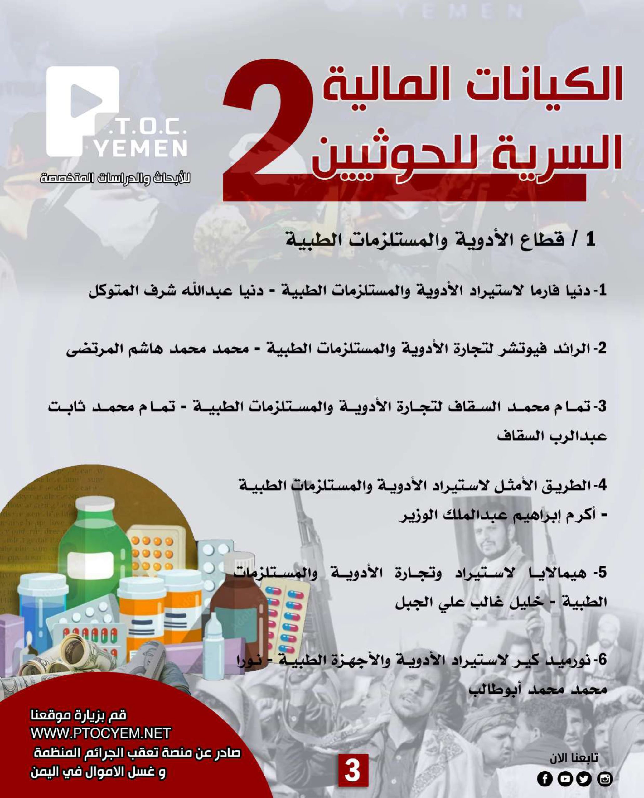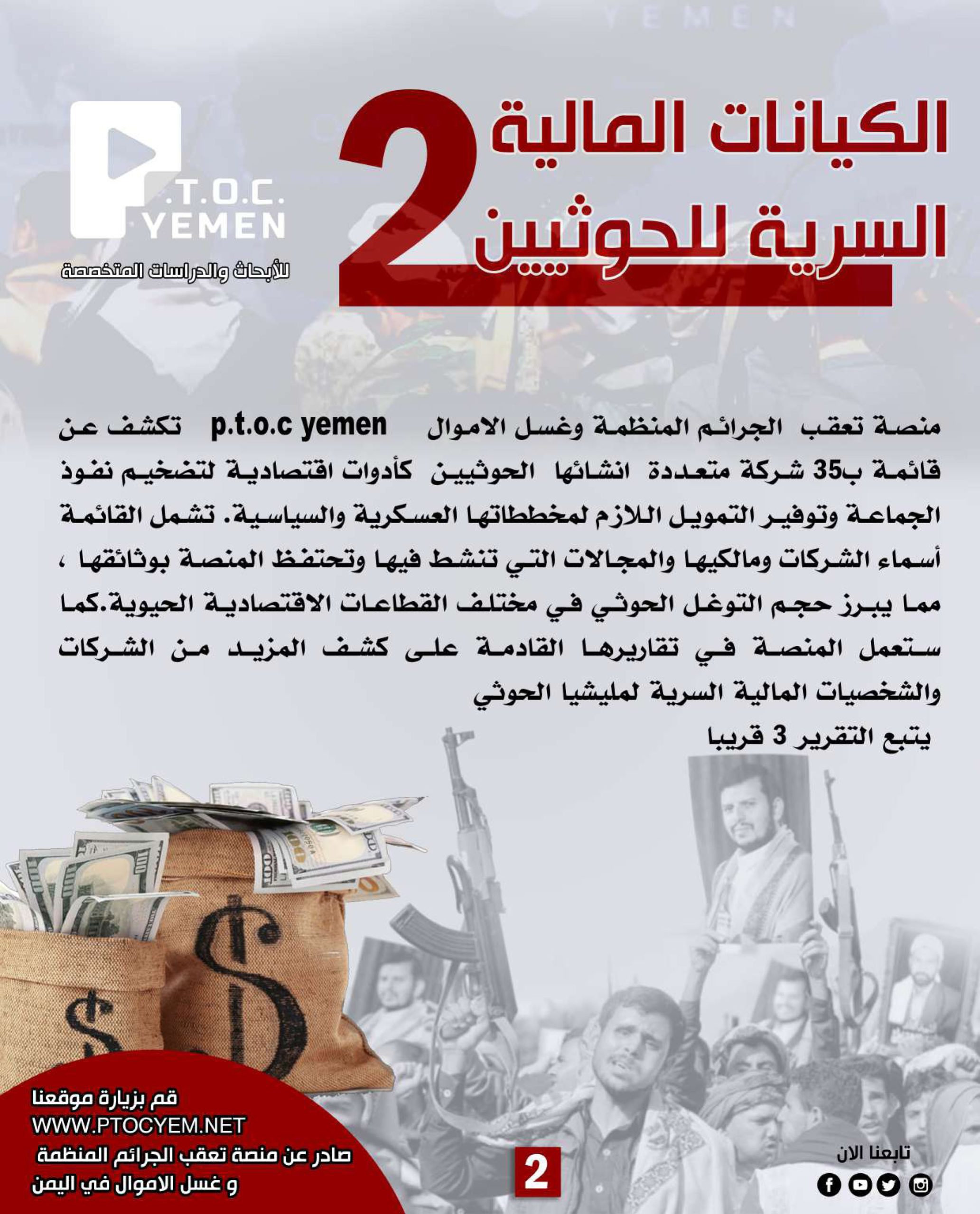 كشفت منصة تعقب الجرائم المنظمة وغسل الأموال في اليمن (P.T.C.O Yemen) عن قائمة جديدة من الشركات التي تعمل لصالح جماعة الحوثيين الموالية لإيران، ضمن سلسلة تقاريرها التي تركّز على الكيانات المالية السرية للجماعة.