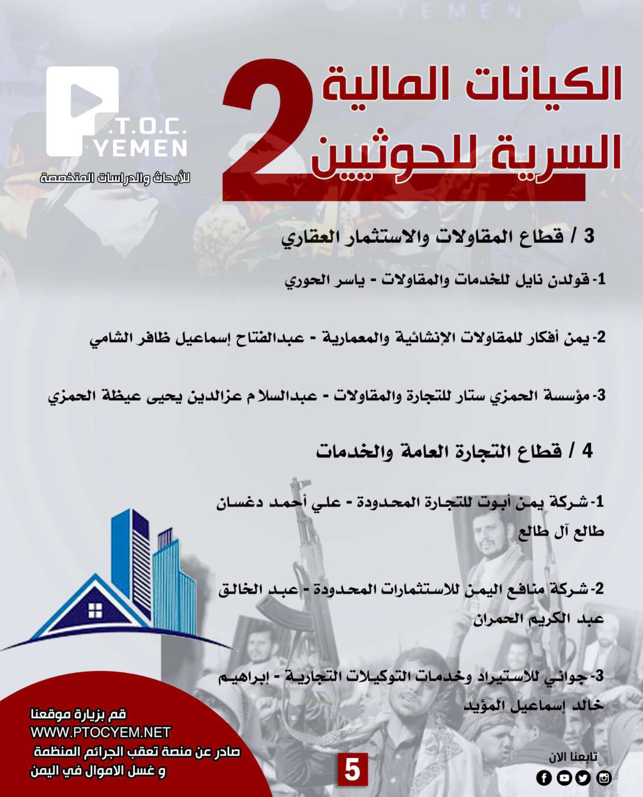 منصة تعقب الجرائم المنظمة وغسل الأموال في اليمن تكشف عن قائمة جديدة لشركات الحوثيين